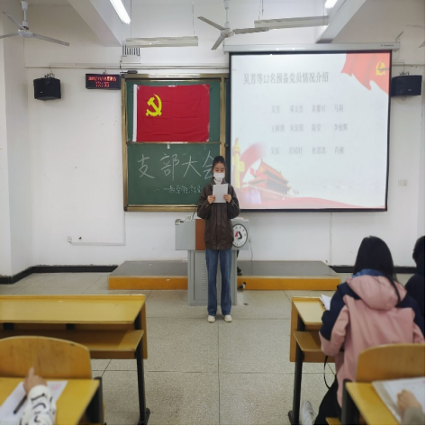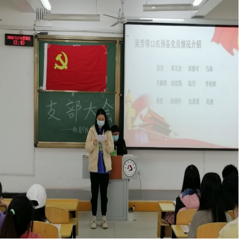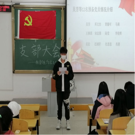 本次大会严格依照吸收预备党员支部大会流程,先由杨愿老师汇报了吴芳等12名同志的审查情况,接下来由各发展对象在大会上依次报告自己的个人基本情况及加入中国共产党的决心,在思想上,他们能够紧跟党的步伐,积极主动学习党的最新理论,在生活中将“为人民服务”贯彻到底,在同学需要帮助时及时伸出援手,工作中尽职尽责,不拖延任务,不推脱责任。