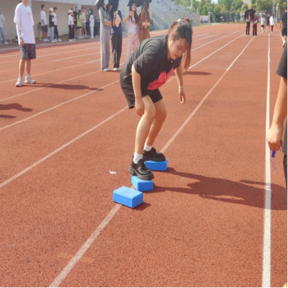 摸石头过河是一个人使用三块“石头”过河,双脚不得触碰地面,依次脚踩“石头”交替前进进行接力,直至所在队伍五名队员完成接力,用时最短的队伍获胜。