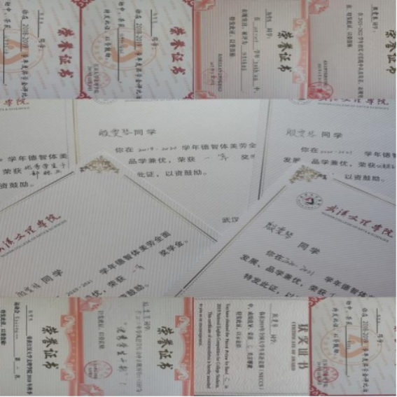 大一曾加入图书馆员工管理委员会组织部,协助老师处理各种事务,前前后后参与举办了多次部门活动。2019年参加湖北省翻译大赛,良好的英语学习习惯使她获得笔译(非专业英语组)初、决赛三等奖,同年被评为学风建设活动“学习标兵”。