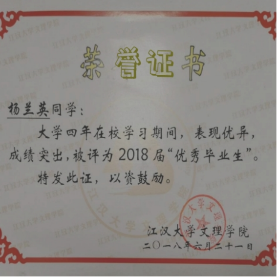 杨兰英,女,中共党员,毕业于14级应用心理学专业(2018年毕业),毕业后考取了黄冈市罗田县的农村义务教师,在罗田县九资河镇中心小学任教两年,两年期间担任过语文、英语、科学学科的教学以及班主任工作。2021年9月考上经济开发区(汉南区)育才第二小学,现是一名全职心理健康老师。