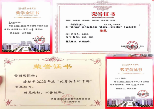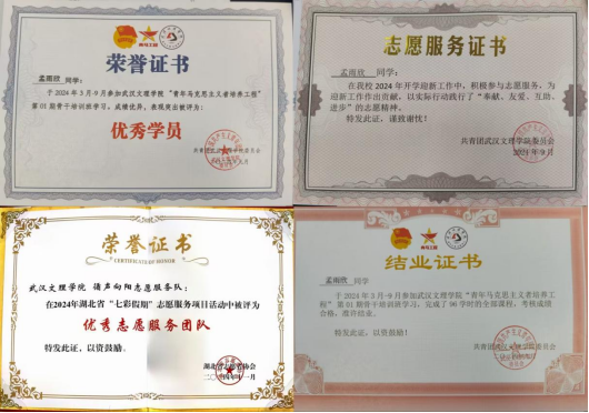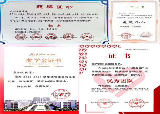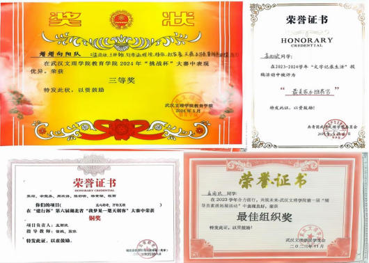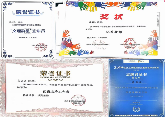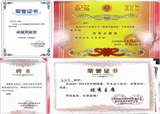 曾任校团委副书记、校广播台台长,负责青春武汉文理公众号、团团文理视频号等多平台,发文累计超716余篇,负责部门及广播台连续三年获优秀部门、优秀团队,现任21小教5班团支书、班长,综测成绩连续四年班级第一,获和润综合奖学金(全校仅5人),多次获市、校级优秀干部称号,在校期间,共获国家级、校级、院级荣誉40余项。主持beats365官网亚洲网页版二十周年校庆庆典,作为唯一一名员工代表在校级教师节表彰大会发言。朗诵《雾重庆》入围CCTV朗诵比赛,广告作品获公司奖、入选国际展览、中国青年员工国防教育数字创意比赛湖北省三等奖。带领循声向阳志愿服务队参与2024暑期社会实践,获省级优秀团队,获校级优秀团队、优秀先进个人,带队参加房县青春阵地朗诵和五四文理群星先导片录制,作为第一批青马骨干班班班长,带领大家在理论与实践中学习体验,以97.2分成绩结业获优秀学员。投身支教和应急科普,参与全国APP公益实习,获全国优秀实习生,组织江岸区红领巾小小应急宣传员项目,为武汉市超20个社区,共计2000余人次服务,受邀成为江岸区首批安全宣推官,并将志愿服务经历凝聚为科技成果,获互联网+、挑战杯省级铜奖,个人经历受到人民网、学习强国多个平台报道。