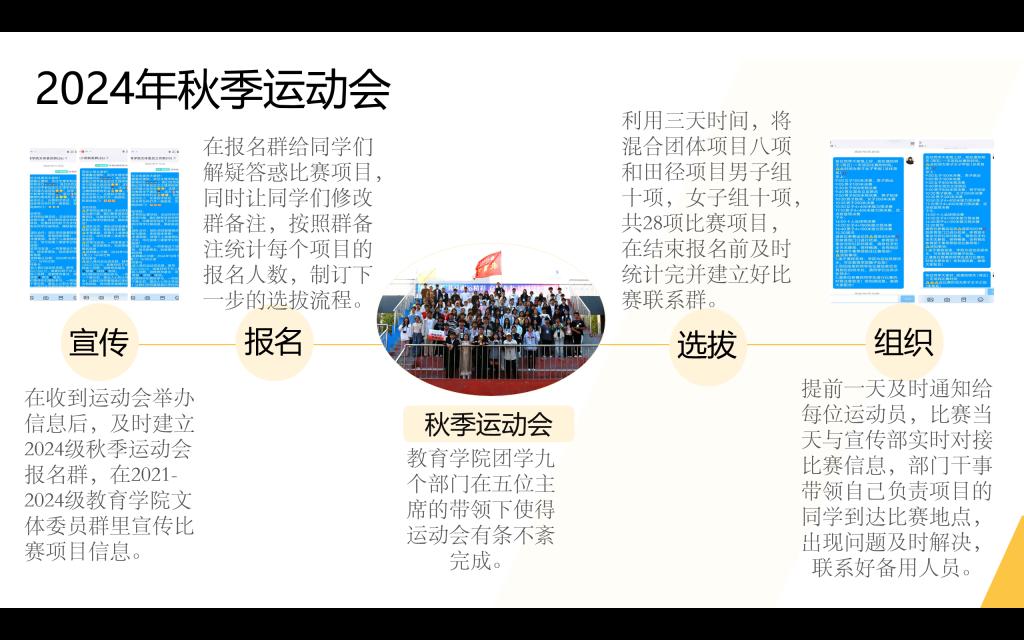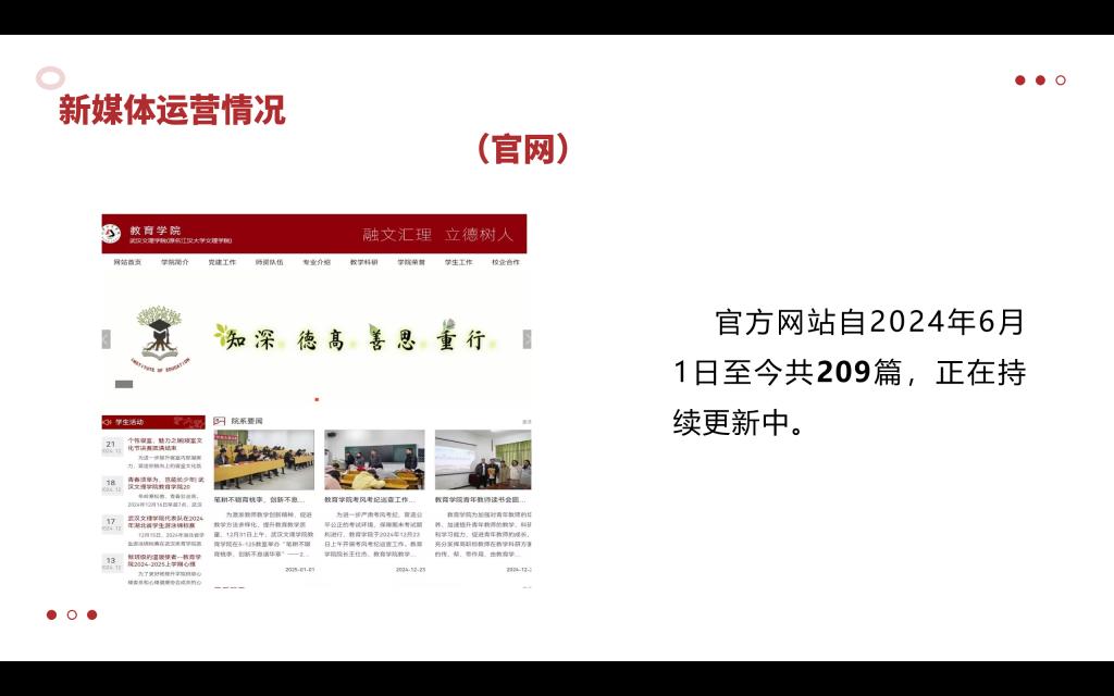 宣传部在各各平台积极宣传获得显著成果,公众号“beats365”2024年6月1日至2024年11月14日共计发布公众号617篇,粉丝数达3971人。官方QQ“beats365”2024年6月1日至2024年1月17日共计发布918篇,浏览量达28万人次。官方抖音“教小育”2024年6月5日至今共发布作品138篇,获赞8054,粉丝人数589,总浏览量54万。官方网站自2024年6月1日至今共209篇,正在持续更新中。