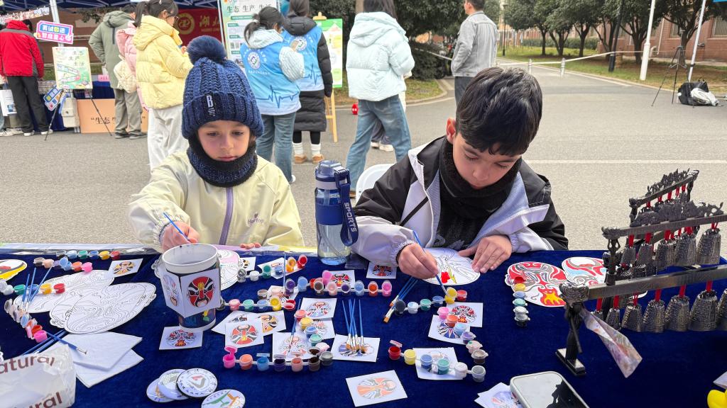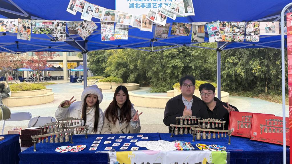 下午两点,公益展示环节正式开始。服务队通过成果展板陈列、非遗实物体验与互动讲解相结合的形式,向现场师生及各高校代表全面展示了团队志愿服务的特色亮点与实践成效。展位前吸引了众多师生驻足,大家亲手体验敲击编钟、绘制楚剧脸谱,在沉浸式互动中感受非遗文化的魅力。