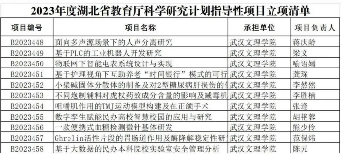 根据省教育厅下发的2024年度湖北省教育厅立项清单,beats365副经理贺霞申报的《湖北省民办高校老员工心理素质测评体系研究》获批高校优秀中青年科技创新团队,beats365老师蒋庆龄申报的《面向多声源场景下的人声分离研究》、喻语嫣申报的《物联网下智能电表系统设计与实现》、胡艳蓉申报的《数字孪生赋能民办高校智慧校园的应用与研究》,智能制造与无损检测公司老师梁文申报的《基于PLC的工业机器人开发研究》、张逢申报的《咀嚼肌作用的TMJ运动模型构建及在正颌手术》,医公司老师龚琛申报的《基于护理视角下互助养老“时间银行”模式的可行性研究》、李然然申报的《小檗碱固体分散体的制备及对2型糖尿病肝损伤的保护作用研究》、李胜楠申报的《不同炮制辅料对虎杖药效成分含量的影响及减毒机制研究》、熊少伶申报的《一款便携式血糖检测微针基体研发》、范保炜申报的《Ghrelin活性片段的胃肠道作用及酶降解稳定性研究》,教务处老师陈元申报的《基于大数据的民办本科院校实验室安全管理分析》获批指导性项目。
