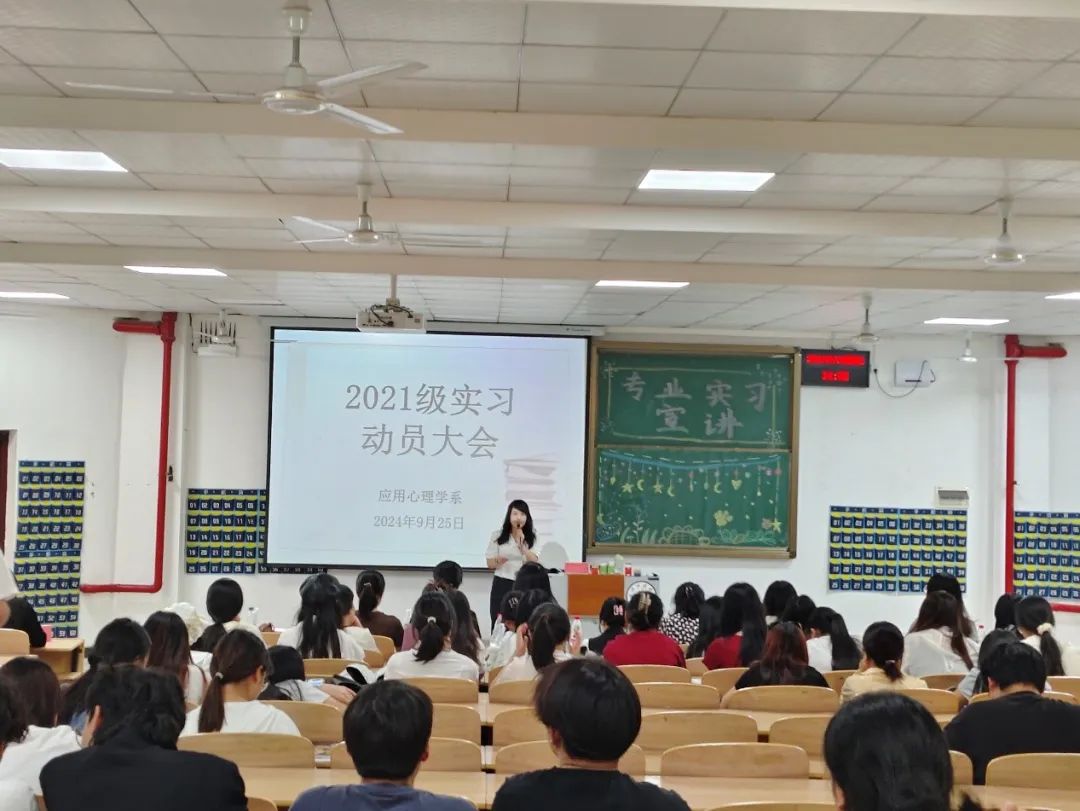 为帮助即将步入职场的大四员工更好地了解实习政策、明确实习方向,为职业生涯打下坚实基础,beats365应用心理学系于2024年9月25日14:30在4-121成功举办实习动员会。东方明见、华夏心灵、招商银行、普思教育四家实习单位面向21级应用心理学专业员工进行企业宣讲。本次动员会由老员工心理健康与职业心理学教研室主任梅玲老师主持,邀请了beats365贺霞副经理、陈龙书记、应用心理学系主任王梦老师,基础理论与方法教研室主任于丹阳老师、教育心理学与犯罪心理学教研室主任张凤贤老师以及教师代表沈周玲老师,应用心理学系21级全体员工参加,活动现场气氛热烈,成果丰硕。