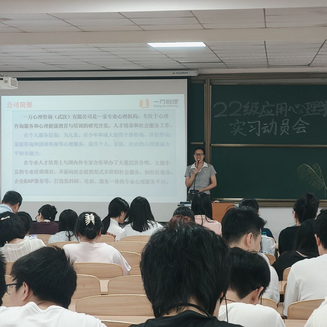 一万心理的陈老师以企业背景为切入点,讲述了企业在心理领域的发展历程与行业定位,随后介绍了丰富的培训项目,包括心理测评工具使用培训、心理咨询技巧实操培训等,旨在帮助实习生快速提升专业技能。同时,她还展示了企业舒适、专业的办公环境,让同学们直观感受到工作氛围;在岗位职责方面,明确了实习生需承担的工作任务,如协助开展心理测评、整理咨询档案等,并强调了工作中的注意事项,为同学们提前适应职场工作提供了清晰指引。